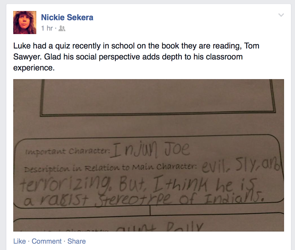 Kids are being made, kids are being born, kids are growing up. As I get older more and more of my friends are having kids of their own. From my precociously perfect goddaughters to baby Robin just a few days old (welcome little one!) I have lots of friends taking the brave and not-so-easy road of bringing new humans into the world. It isn’t easy, and I have lots of respect for what it takes to be a parent. And sometimes, I feel blown away by how well some of my friends are doing with this difficult task – not only raising their kids with love, but also empowering them to courageously speak their truths and see past historical injustice. My friend Pakou comes to mind, who often shares the heart-wrenching and insightful conversations her girls have about race and privilege. And today, I saw a beautiful illustration of this in a Facebook post from my friend and one of my role models, Nickie Sekera, about her son 10-year-old Luke.