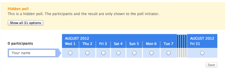 - I used the free online scheduling tool Doodle to create a poll. I chose each day for the month of August, and closed the poll so that each participant can only choose one date, and each date can only have one participant. This is a simple way for me to ensure I have a person to call each day, without having to go back & forth on scheduling. I’ve closed the poll so that only I can see the responses, and asked participants to indicate a time frame that works for me to reach them.